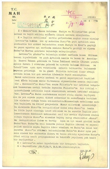 وجاء كشفت المخابرات التركية عن الوثائق بمناسبة الذكرى الـ99 لتأسيس جهاز “الاستخبارات الوطني التركي” ومن بينها الوثيقة المؤرخة في 23 سبتمبر 1929، وتؤكد نشاطات الجاسوس “لورانس العرب” في دول المنطقة وخاصة في فلسطين.